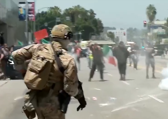 La tensión en la ciudad se disparó horas después, cuando una manifestación pacífica en el centro cívico de Los Ángeles se tornó caótica al acercarse la hora del segundo toque de queda consecutivo. Agentes de policía antidisturbios, muchos a caballo, cargaron contra los manifestantes, golpeándolos con bastones de madera y disparando proyectiles de control de multitudes. Una joven resultó herida tras ser alcanzada en la cadera, mientras se retorcía de dolor en el suelo.