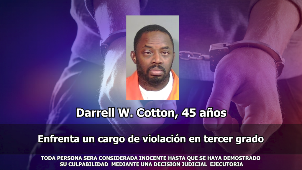 El 8 de octubre, agentes de la Unidad de Víctimas Especiales detuvieron a Darrell W. Cotton, de 45 años, por presuntos delitos sexuales cometidos contra un menor. Tras una entrevista con el sospechoso y la recolección de más pruebas, los investigadores procedieron con su arresto.