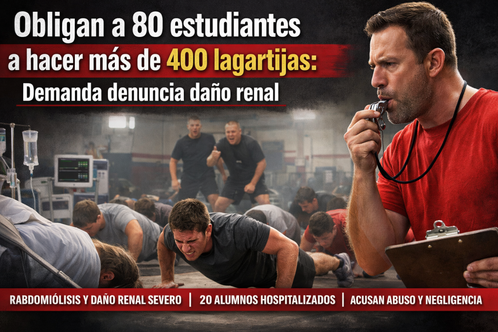 Casi 80 estudiantes de una escuela chárter en San Angelo, Texas, fueron obligados a hacer más de 400 lagartijas durante una clase de aproximadamente 45 minutos, según una demanda presentada por 12 familias. El caso señala que el 25 de febrero de 2026, el entrenador principal de fútbol de Texas Leadership Charter Academy ordenó ejercicios continuos, guiados por silbato, sin permitir agua, descanso ni pausas.